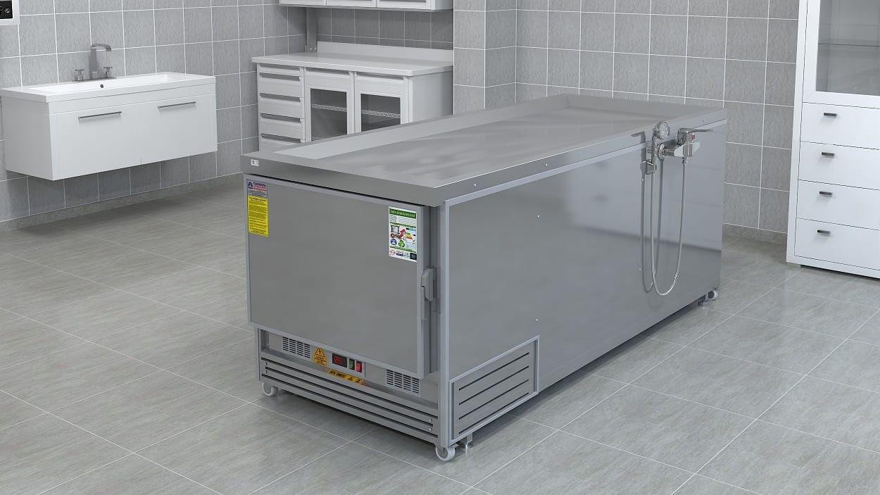 YS MORG 009 R-XLİNE STEEL, morg ve gasilhane projeleri için tasarlanmış, baştan yüklemeli ve cenaze yıkamalı profesyonel morg ünitesidir.