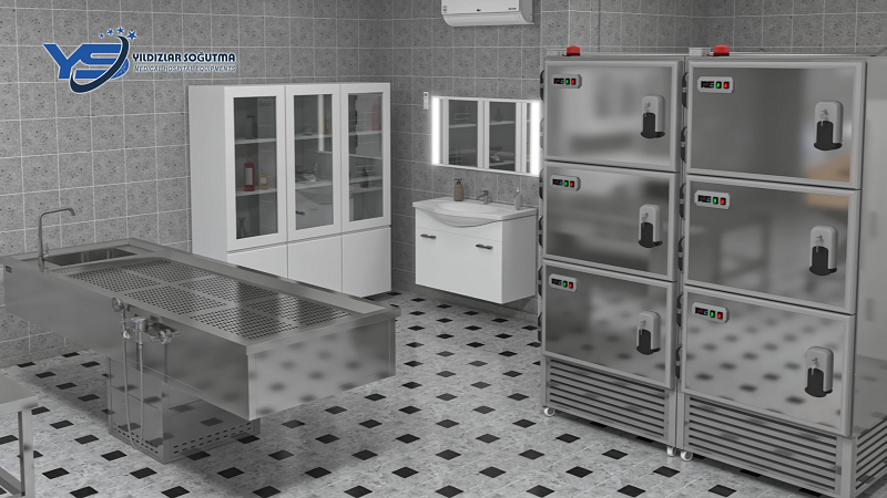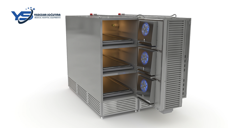 Ürün Tanımı 3 cesetlik, baştan (üstten) yüklemeli, çelik karkaslı paslanmaz morg ünitesi