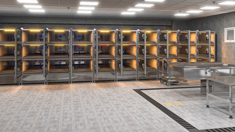 Her hücrede paslanmaz konveyör ve ray sistemi ile kolay yükleme/çıkarma.